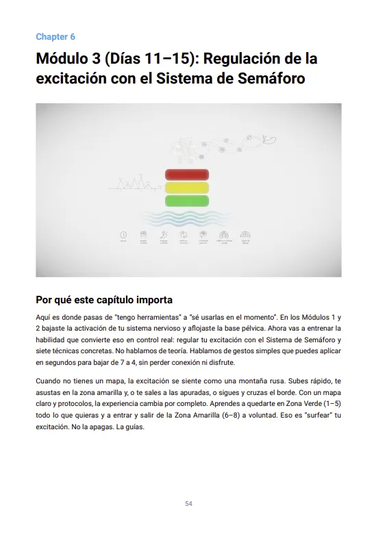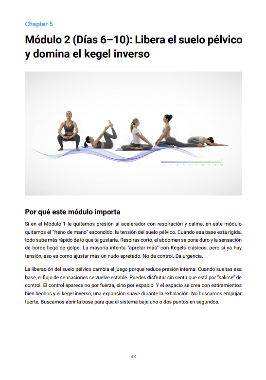 Cada módulo está diseñado con precisión para reeducar la respuesta sexual de tu cuerpo a través de una reeducación neuromuscular probada y la regulación del sistema nervioso.