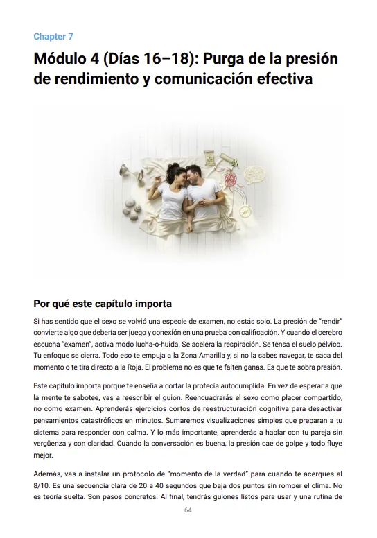 Reconfigurar los patrones mentales y emocionales que crean el círculo vicioso de ansiedad y rendimiento. Tu cerebro ha aprendido a asociar el sexo con el fracaso y la vergüenza, lo que crea una profecía autocumplida. (Sin abordar esto, incluso si mejoras físicamente, la presión mental te saboteará).